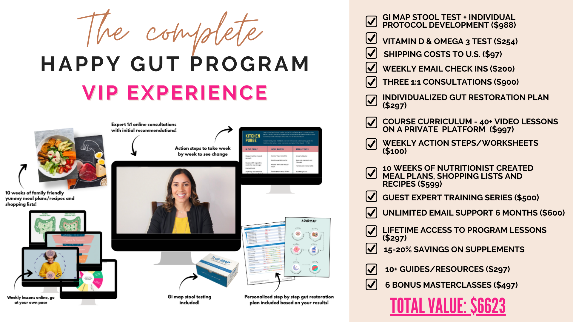 The actual program price for the Happy Gut VIP program is $2650 with monthly payment plans available!